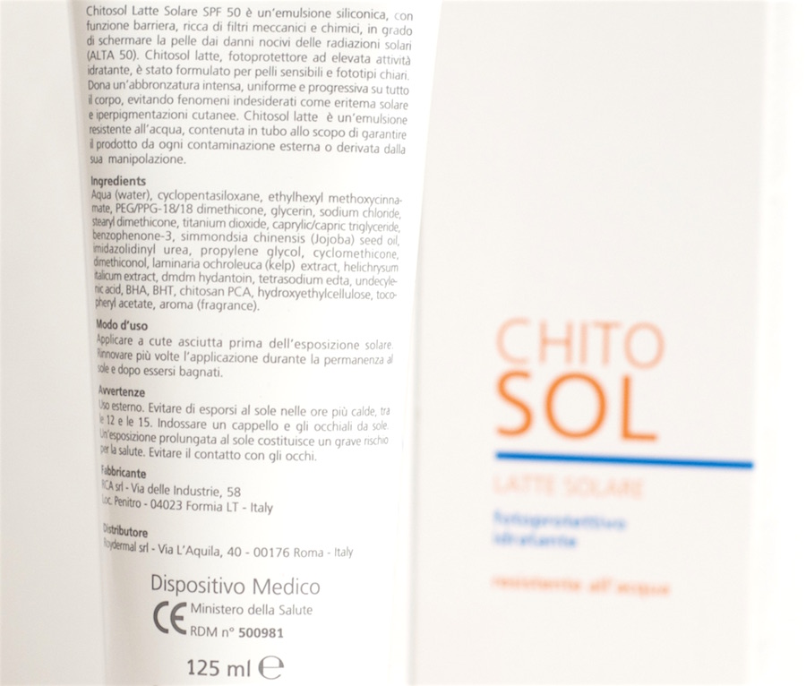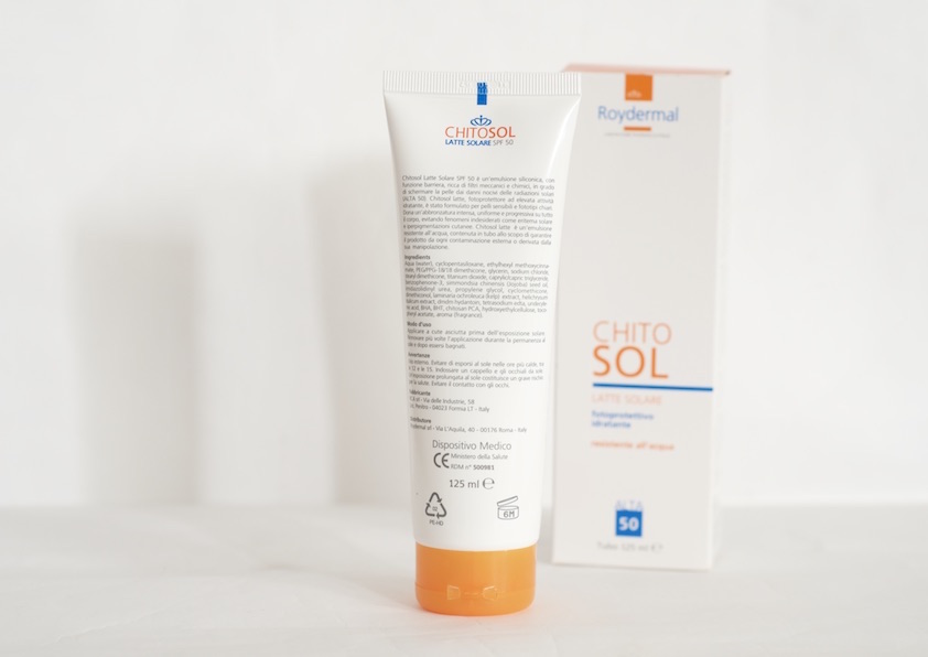 Ho scelto il latte solare ChitoSol di Roydermal nella formulazione con fattore di protezione ALTA 50. Un prodotto farmaceutico di altissima qualità, come pochi sul mercato e registrato come Dispositivo Medico dal Ministero della Salute.
